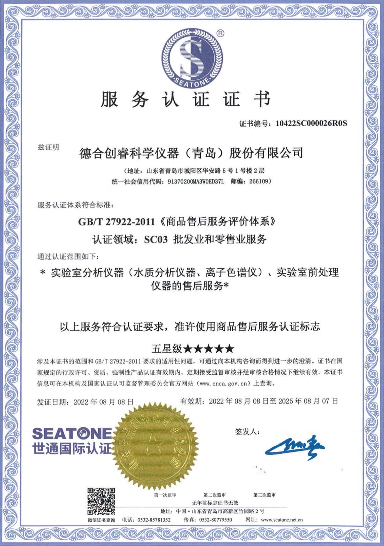 8月10日,德合創睿憑借完善的服務體系、優秀的服務質量,一次性高分通過GB/T 27922-2011《商品售后服務評價體系》的認證審核,喜獲“五星級售后服務”認證證書。認證專家對德合創睿的服務體系建設給予了高度評價和贊賞!