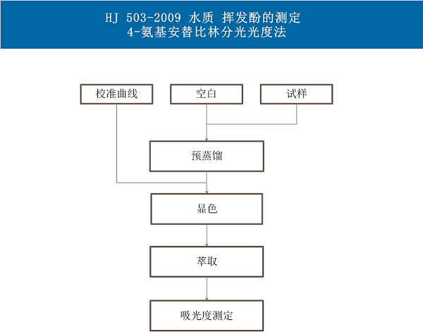 HJ 503-2009 《水質(zhì) 揮發(fā)酚的測定 4-氨基安替比林分光光度法》是水質(zhì)揮發(fā)酚檢測的常用標(biāo)準(zhǔn)之一,其第一法為萃取分光光度法,通過蒸餾使揮發(fā)性酚類化合物與干擾物質(zhì)和固定劑分離,蒸餾出的酚類化合物于pH(10.0±0.2)介質(zhì)中,在K3[Fe(CN)6]存在下,與4-氨基安替比林反應(yīng)生成橙紅色的安替比林染料,用CHCl3萃取,在460nm波長下測定吸光度。前處理過程可用到全自動智能一體化蒸餾儀和全自動液液萃取儀,實驗流程如下所示: