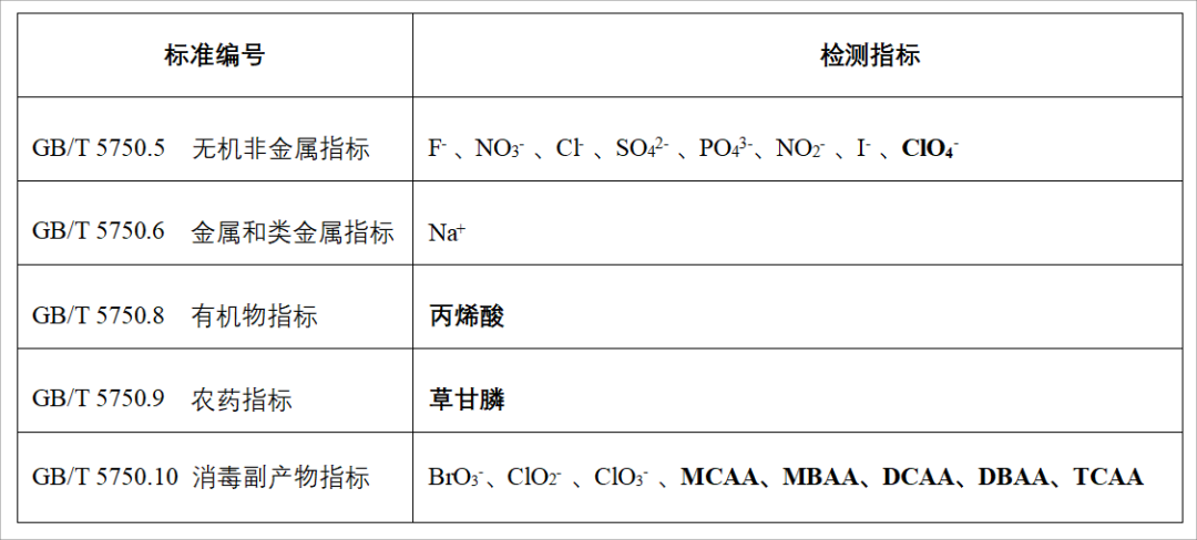 GB/T 5750-2023《生活飲用水標(biāo)準(zhǔn)檢驗方法》是GB 5749-2022《生活飲用水衛(wèi)生標(biāo)準(zhǔn)》中各指標(biāo)的檢驗方法標(biāo)準(zhǔn),主要分為13個部分,其中可以應(yīng)用到離子色譜技術(shù)的分別為GB/T 5750.5《生活飲用水標(biāo)準(zhǔn)檢驗方法 無機非金屬指標(biāo)》、GB/T 5750.6《生活飲用水標(biāo)準(zhǔn)檢驗方法 金屬指標(biāo)》、GB/T 5750.9《生活飲用水標(biāo)準(zhǔn)檢驗方法 農(nóng)藥指標(biāo)》和GB/T 5750.10《生活飲用水標(biāo)準(zhǔn)檢驗方法 消毒副產(chǎn)物指標(biāo)》中的部分檢測項目,具體情況如下: